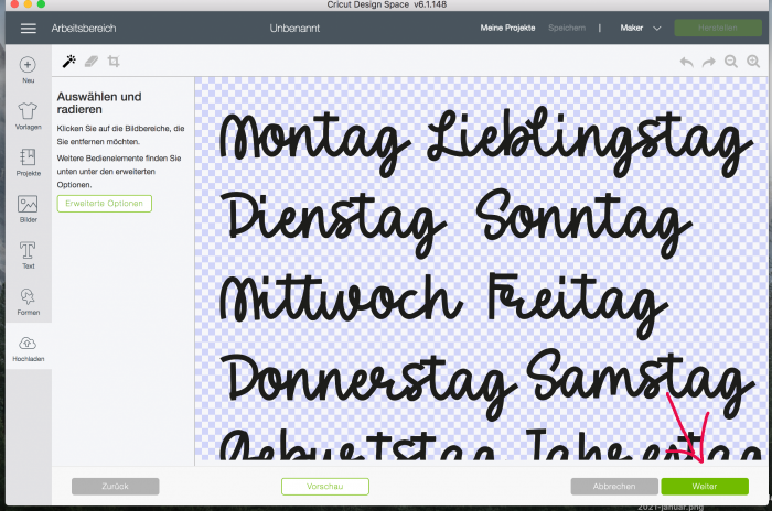 Im ersten Versuch habe ich mich für das PNG entschieden. Ich nutze dieses Format gerne, weil es Transparenz speichern kann. Das Bild wird also so, wie hier in der Vorschau zu sehen, in eine Schneidedatei umgewandelt. Als Bildtyp wähle ich „einfach“.