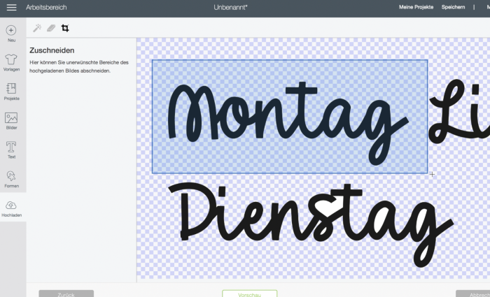 Mit dem Freistellungs-Werkzeug, könnt Ihr einzelne Bereiche eines Bildes speichern. Wenn Ihr von der Wochentage-Vorlage zum Beispiel nur den Montag braucht, wählt Ihr den aus und speichert ihn als eigene Datei: