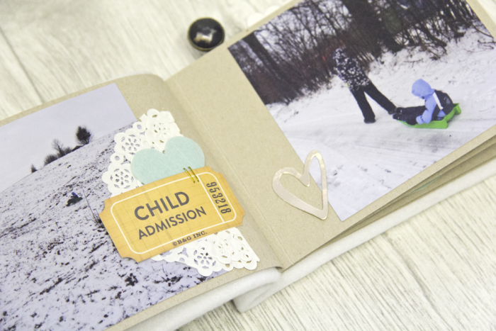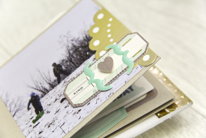 Für die Seiten habe ich einfach verschiedene Formate und Muster Patterned Paper und kleine Kraftpapiertüten gefaltet und eingebunden. Außerdem gibt es Klappen und Pockets und ganz viel Schnickeldi.