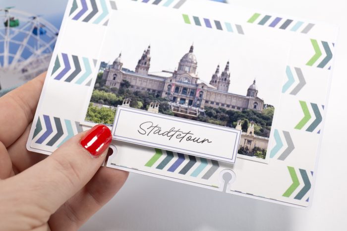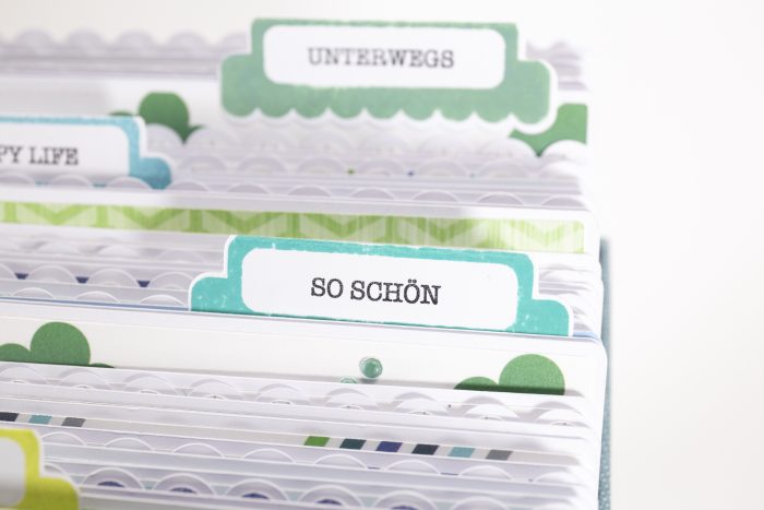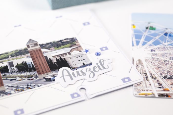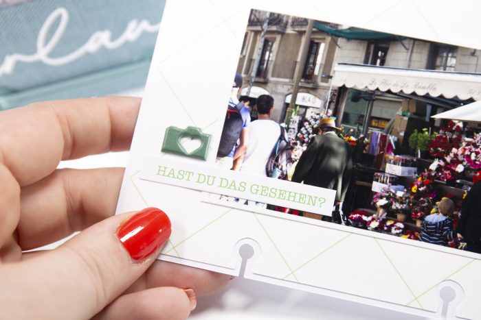 Die neue Kollektion „Scrapliebe Reise“ ist hier zum Einsatz gekommen und ich stehe auf den Schnickendi, der auf das Papier abgestimmt ist: Stempel, Stanzen und passende Sticker – ich bin glücklich!!