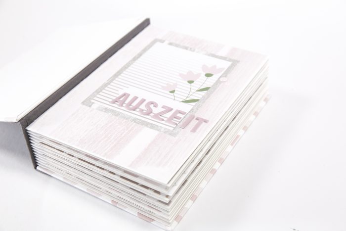 Die Wort-Fadenbindung ist immer wieder ein ganz besonderer Hingucker im Regal. Hier in Kombi mit meinem neuen Scrapliebe Papier „Vintage Blümchen“. Ok, der Name war jetzt nicht das Berühmteste, was ich mir jemals ausgedacht habe, aber die Papiere sind superschön! Passend gibt es auch wieder Sticker und ein zauberhaftes Stanzenset. Findet Ihr alles hier beim Creative Depot im Shop.